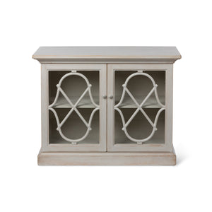 This console is perfectly sized for a foyer or bathroom to stow towels, scarves, hats and gloves; anything that needs to be kept at the ready. The quatrefoil overlay design on the glass doors is timeless and classic for a traditional and elegant space.