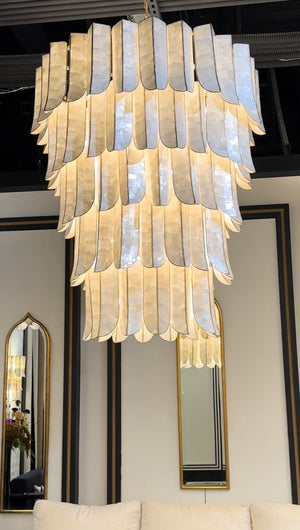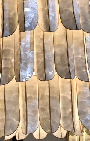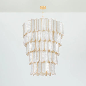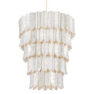 Capturing the dynamism of its namesake city, Cartagena cuts an impressive figure with its shimmering layers and exquisite materiality. Tiers of lustrous leaf-shaped panels crafted from fine Capiz Shell exude drama and decadence. Vintage Gold Leaf heightens the glamor of this statement piece, which comes as a sconce or chandelier in three sizes.