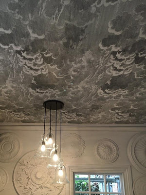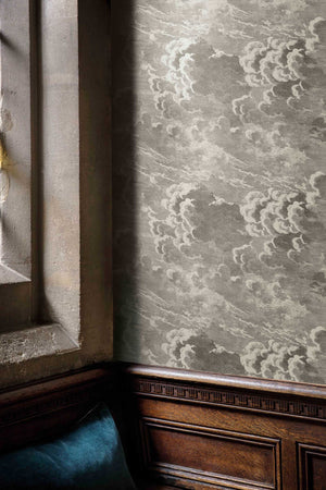 Full blown clouds with metallic hints float from side to side. These ‘little clouds’ are delicately detailed etchings depicting tempestuous, rolling skies. The sky was long a recurring vision for Fornasetti and these ‘little clouds’ are delicately detailed etchings depicting tempestuous, rolling skies.