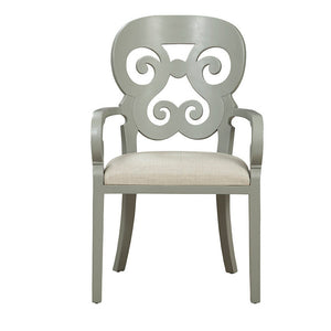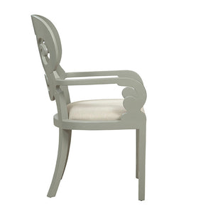 The Gray Carved Back Chair blends classical elegance with a modern aesthetic, creating a captivating piece for any space. The unique light grey, almost grey-greenish color adds a more modern touch to your décor. Its smooth, curved design with straight front legs and curved back legs exudes a blend of contemporary and classic styling. The intricate carvings on the back reminiscent of antique chairs add a touch of charm to the overall modern look. With a comfortable linen cushion, this chair is not only stylish but also inviting for relaxation.