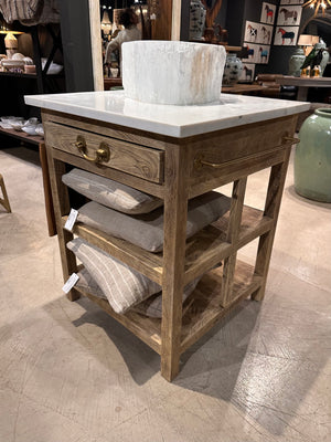 Open-concept kitchens and dining spaces will find great utility with the Newport Islands. Crafted from bleached mango wood that features deep, open shelves and drawers, the Newport Island is accented in brass hardware, including four hooks on one side and a towel rack on the other. Finishing this generational piece is a white Banswara marble top. Available in Small and Large.