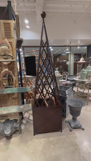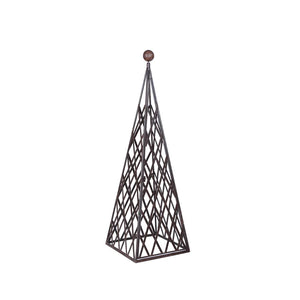 Made of iron, the Topiary Obelisk Large stands a massive 93 inches tall. The triangular, latticed tower is attached to the square base by latches, making it easy to detach. The top also features a "door" to reach plants inside. It can be used solely to add structural interest to an outdoor landscape or to support a vining plant. The Topiary Obelisk Large has a rustic finish.