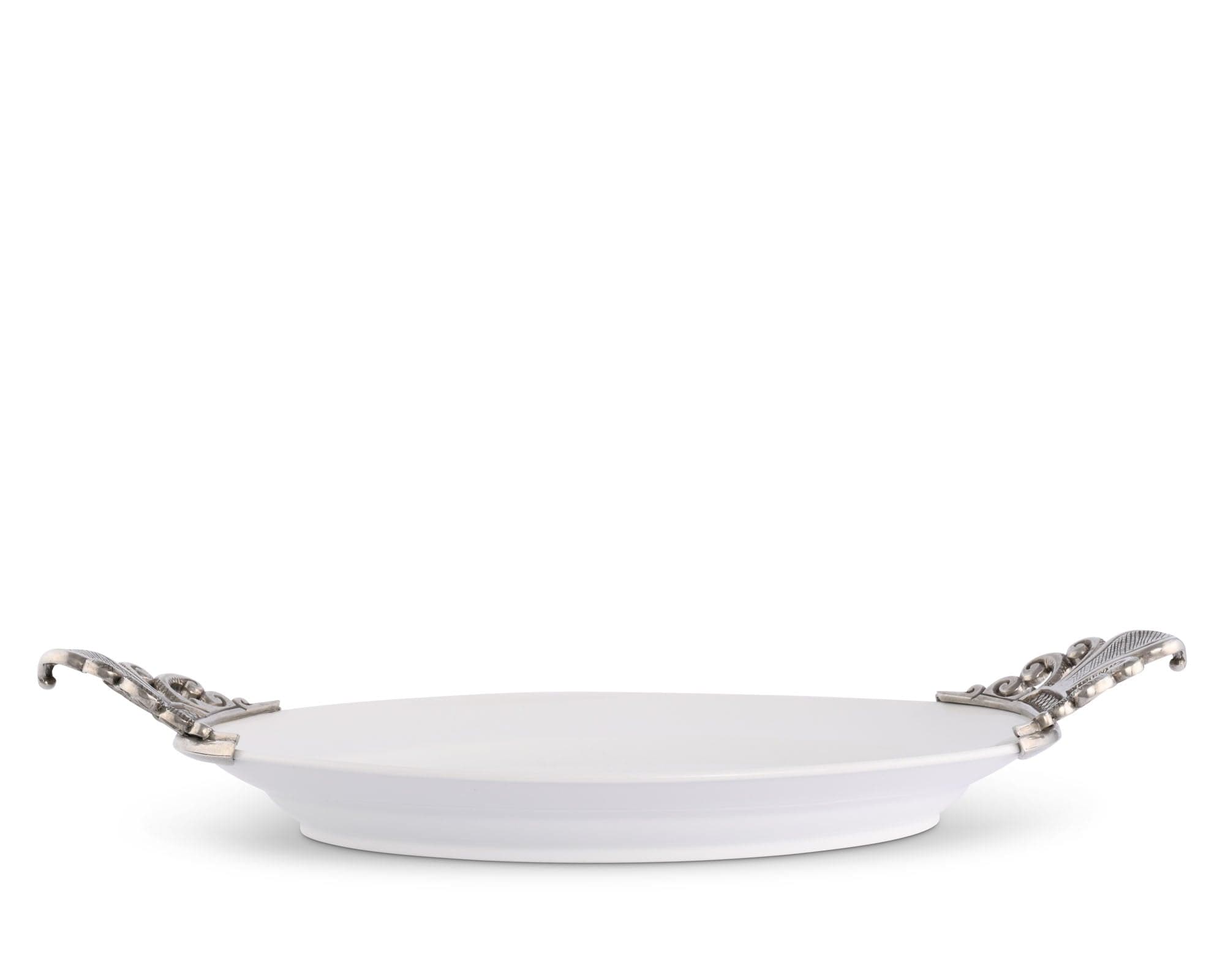 Embodying the elegance of southern France, Vagabond House's Provencal Serving Tray is a blend of exceptional craftsmanship and artistic charm. Unique pewter embellishments, inspired by the iconic Fleur-de-lis symbol, extend off both sides of the stoneware, serving as slightly upturned handles. This tray's generous size of 24" L x 14" W x 2" H is perfect for luxury entertaining, making it an Evocative Pewter Serving Tray, ideal for elegant garden parties or as a unique anniversary gift.