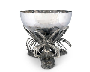 This Lobster Ice Tub showcases intricate ocean-inspired artistry in its refined design. Crafted by hand from premium pewter, three lobsters are rendered with remarkable lifelike detail, featuring gracefully curved legs and elongated antennae. Resting on turbine-like rocks, these sculpted figures lift their textured forms to hold the stainless steel bowl, creating a striking composition of precision and dynamic motion.