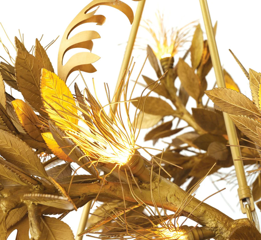 Inspired by the mimosa blossoms of an Albizia tree, this gorgeous chandelier features solid cast brass with hand-applied brass leaves and blossoms. LED lighting and includes adjustable hanging hardware.
