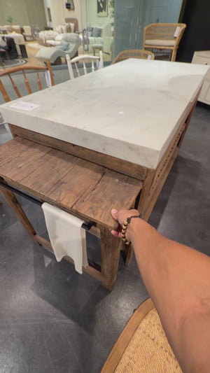 Our Rustic Marble Island, a truly unique piece crafted from reclaimed wood and topped with a luxurious marble counter. This island features a special pull-out table that can comfortably seat two to four people, along with space for two stools on one side of the marble counter. On the other side, a convenient shelf provides the perfect spot for storing wine or kitchen essentials. Combining functionality and beauty seamlessly, the Rustic Marble Island is a standout addition to any kitchen, offering both practicality and aesthetic charm in one exquisite piece.