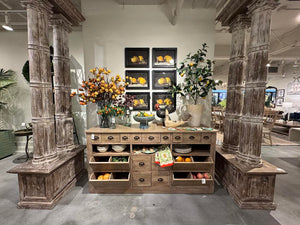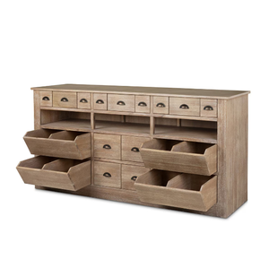 Inspired by the decor of an old general store, this vintage-style pantry counter offers generous storage, including shelves, pull-out bins, and drawers of different sizes. Removable felt drawer liners, provides a resting place for silverware, linens or smaller tools of the trade.