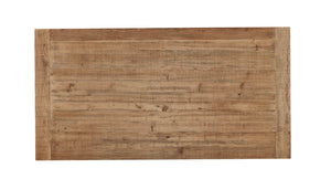 Stretching to a generous length, this reclaimed pine table is anchored by a slightly exaggerated chunky turned leg base. The crisp turnings are painted in a distressed soft dove and the breadboard top is left natural, but made user-friendly with a protective clear coat finish. This table has a breadboard end.