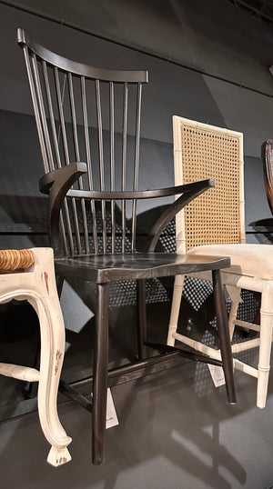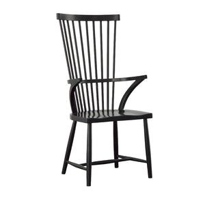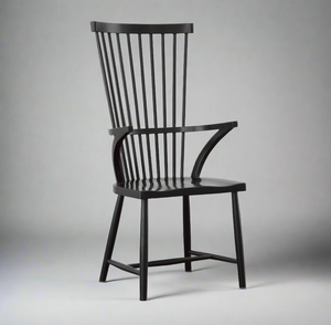 Sharply angled arms and a back which reaches to the sky add graphic interest to this updated Windsor chair. The solid mahogany frame has been finished with a satin black paint, and is a wonderful choice when chairs are needed at the head of the family dining table. A new look for a time honored favorite.